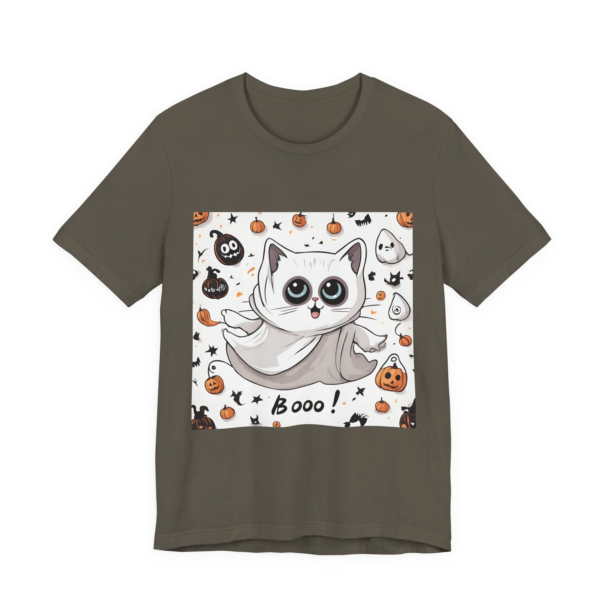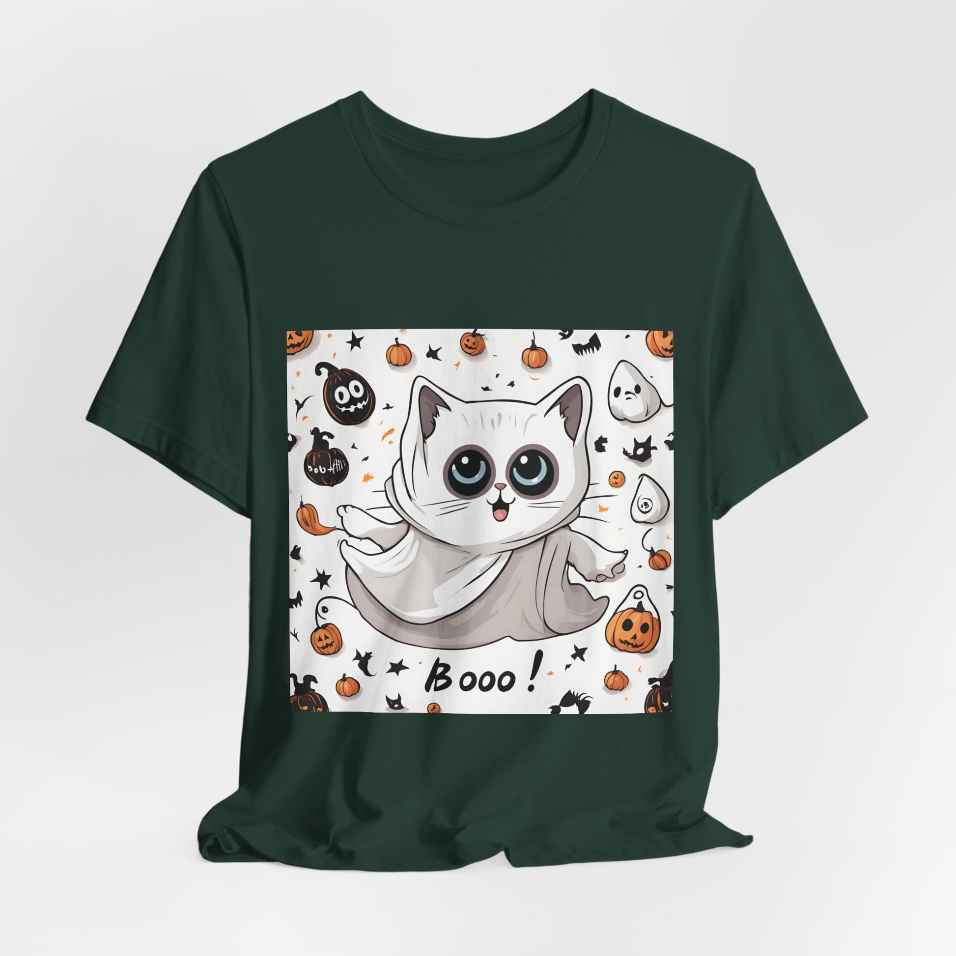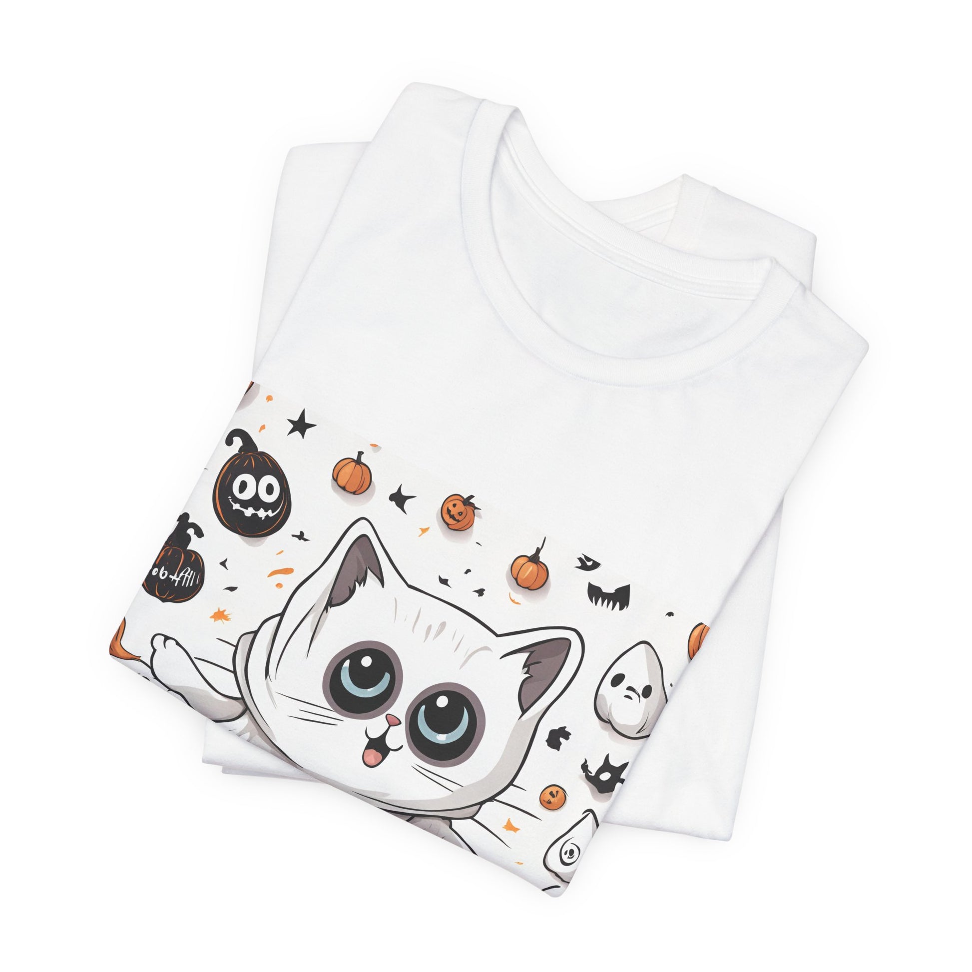 A lightweight, soft cotton tee that brings playful Halloween charm to everyday wear. The front features an illustrated wide-eyed cat draped in a ghost sheet, surrounded by tiny pumpkins, bats, and floating spirits — a cute-and-slightly-spooky scene that reads sweet rather than scary. The retail crew neckline and balanced fit make it easy to layer under jackets or wear on its own. Breathable Airlume combed and ring-spun cotton keeps the shirt comfortable during crisp fall evenings, while the tear-away label keeps irritation away. Subtle production details like stabilized shoulder tape and side seams help the tee hold its shape through washes, so the design stays centered and bright. REACH-certified materials and responsible manufacturing add extra peace of mind for conscious shoppers.