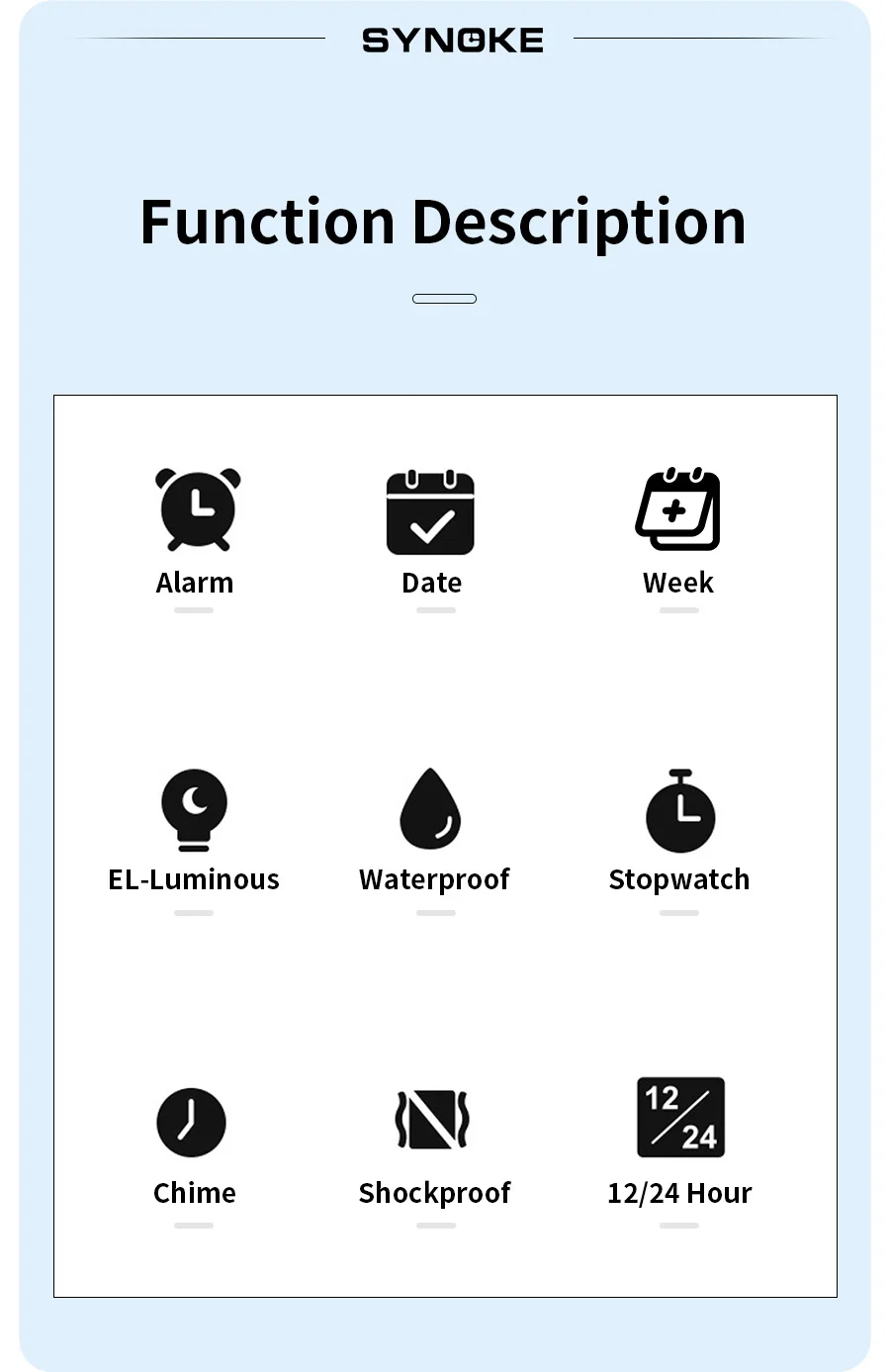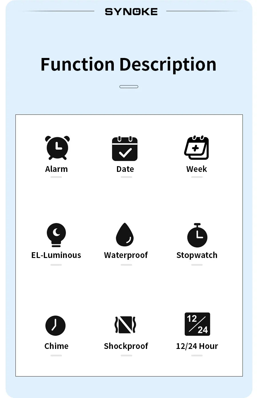Feature: Back Light,Shock Resistant,Complete Calendar,Alarm,Week Display