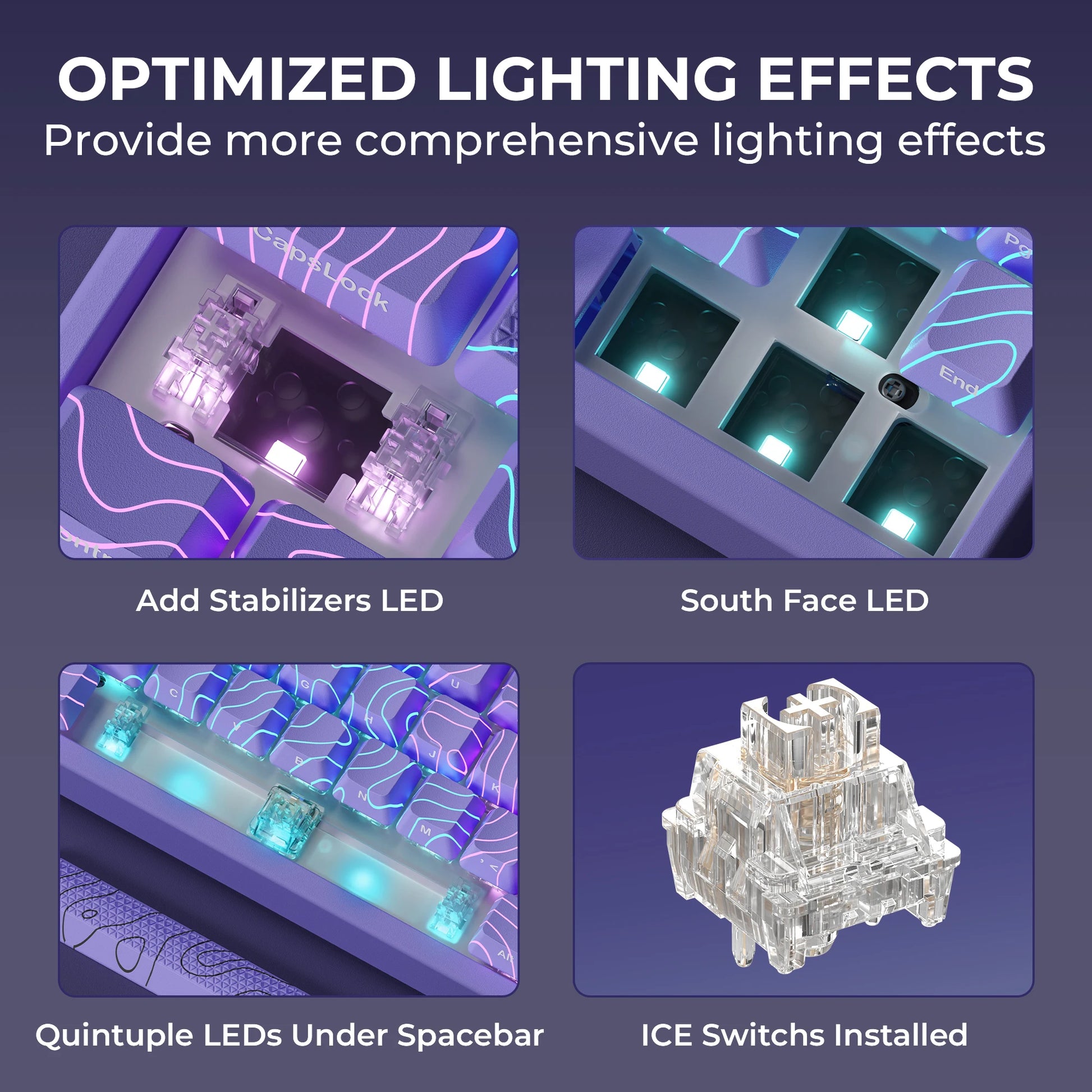 【Here Comes Pattern Shine Through Keyboard】 At the heart of the M67 is the revolutionary use of IMD technology, allowing the RGB light to pass through the pattern of keycap, giving your PC mechanical keyboard an unparalleled aesthetics. The M67 keyboard also features 2 led lights under each stabilizer and 5 led lights on the space bar, the unique design that takes the overall feel and aesthetics of the RGB keyboard to the next level.